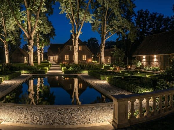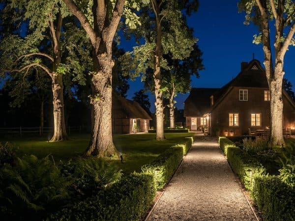 Ländlicher Charme am westlichen Stadtrand – atmosphärische Grundstücksbeleuchtung für Landhäuser und historische Höfe.