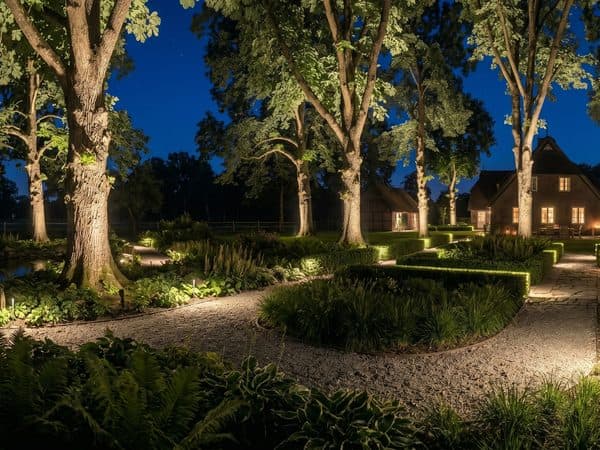 Idyllische Lage mit weitläufigen Grundstücken – Wegebeleuchtung, Baumakzente und stimmungsvolle Terrassenbeleuchtung.